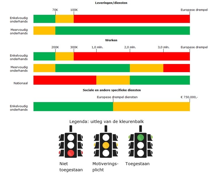 - De geraamde opdrachtwaarde van de betreffende opdracht. In onderstaande kleurenbalken zijn per type aanbestedingsprocedure de aanbestedingsdrempels weergegeven die HHNK hanteert. De Europese aanbestedingsdrempels zijn gebaseerd op de drempelwaarden voor Europese aanbestedingen die elke twee jaar opnieuw worden vastgesteld door de Europese Commissie en aansluiten bij de uitgangspunten van de Gids Proportionaliteit. HHNK hanteert bij aanbestedingen steeds de meest recente Europese aanbestedingsdrempels. Alle bedragen zijn exclusief btw.