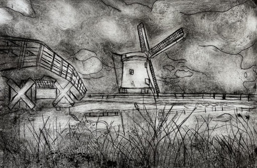 Ik heb deze ets gekozen omdat er een sterk licht-donkercontrast is. Het licht-donkercontrast kan je zien door de lucht en de zwarte grassprieten. De wolken geeft de ets een dynamische uitstraling, alsof er wind door en langs de molen waait. Ik wilde dat de ets een stormachtige uitstraling gaf. De molen staat niet precies in het midden, wat ook weer bijdraagt aan de dynamische uitstraling. Ik heb deze kant van de molen gekozen omdat ik de brug een mooi en belangrijk onderdeel vind van het geheel. Over het algemeen ben ik tevreden met het resultaat en vond ik het een leuke opdracht.