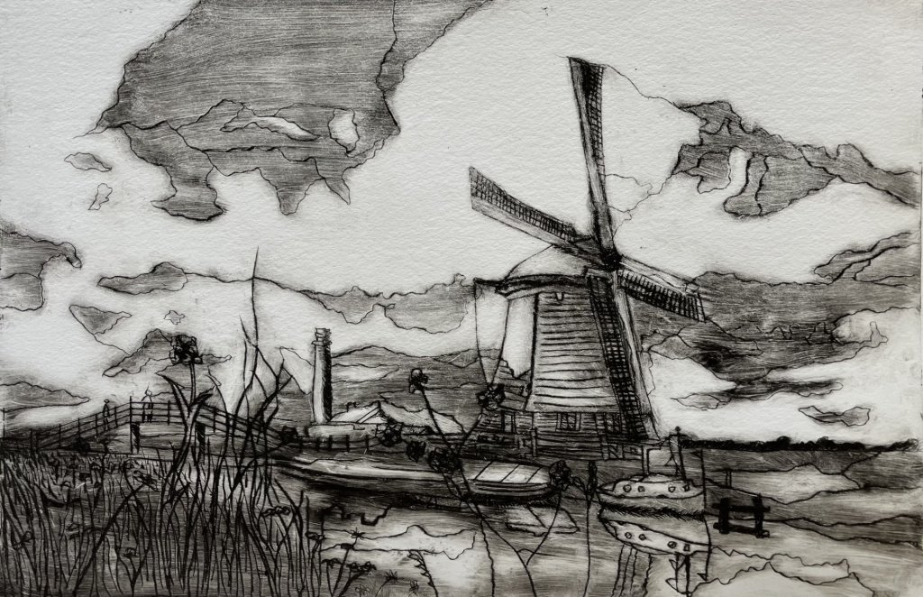 Op mijn werk zijn de Kaagmolen en het stoomgemaal te zien. Ik heb voor deze compositie gekozen, omdat ik denk dat deze de geschiedenis van Nederland goed weergeeft; de Kaagpolder, de molen, het stoomgemaal uit het tijdperk van de industriële revolutie en tot slot het water, dat Nederland heeft gemaakt tot wat het vandaag de dag is. Na een hoop experimenteren met licht en schaduw, kleur en compositie heb ik deze druk (13 van 13) gekozen als mijn eindwerk. Dit omdat het verschil tussen wolk en lucht, en het licht dat op de molen valt hier naar mijn mening goed uit de verf zijn gekomen.