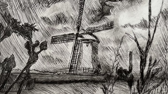 Negen leerlingen van het Han Fortmann (Trinitas College) in Heerhugowaard lieten zich voor hun examenopdracht van het vak Tekenen inspireren door het Rembrandteske polderlandschap. Op een nazomermiddag fietsten zij letterlijk tussen de buien door naar de Kaagmolen en het hulpstoomgemaaltje ernaast in de Kaagpolder tussen Opmeer en Obdam.