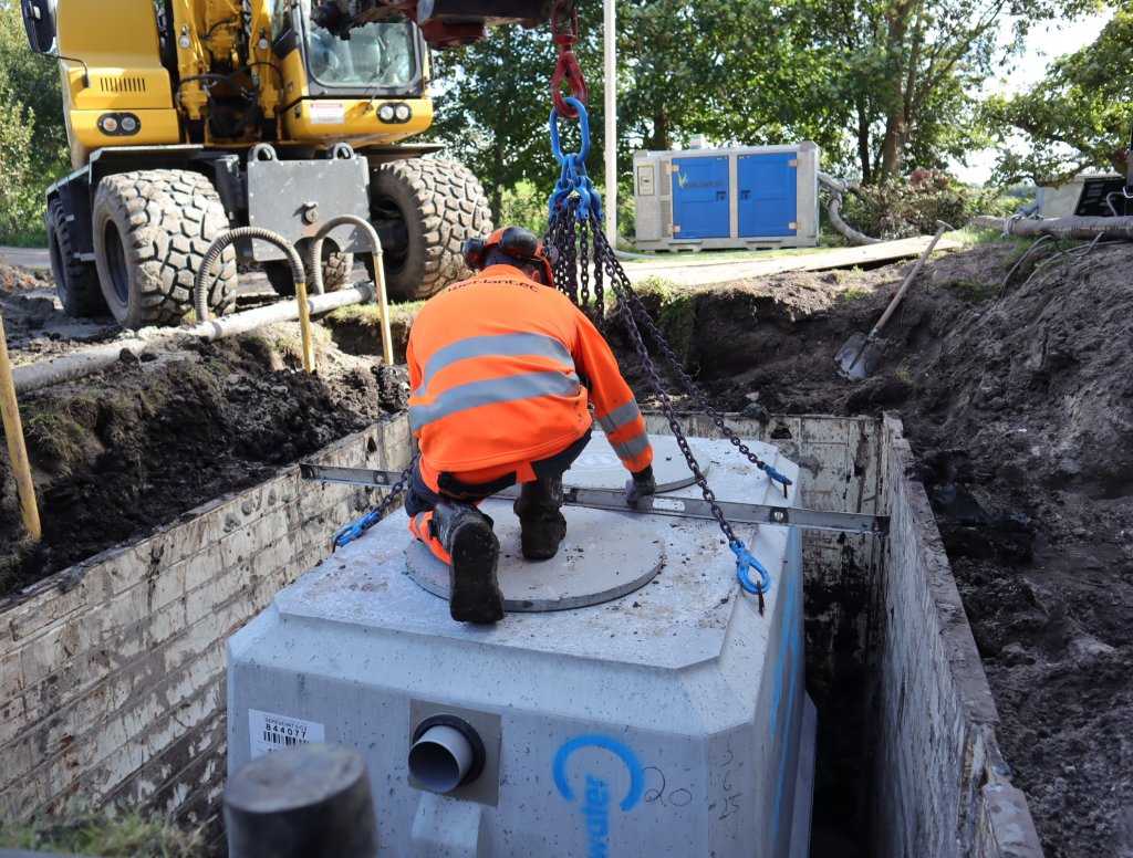 De bestaande installatie wordt in zijn geheel verwijderd, waarna de nieuwe installatie wordt geplaatst. Deze nieuwe installatie is één systeem bestaande uit een aantal geschakelde betonnen putten;